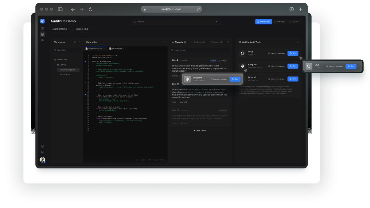 AuditHub is the only platform combining automated vulnerability detection, custom security analysis, and formal verification in one integrated workflow. Get stronger security guarantees without slowing down development.