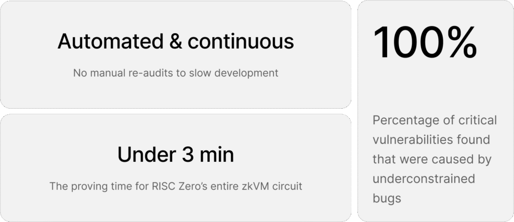 By embedding AuditHub’s Picus tool into their CI/CD pipeline, RISC Zero achieved formal verification of their Keccak accelerator and RISC-V circuits. The platform detected and helped mitigate 35 issues during development. They now have continuous detection of new vulnerabilities as their codebase evolves.
